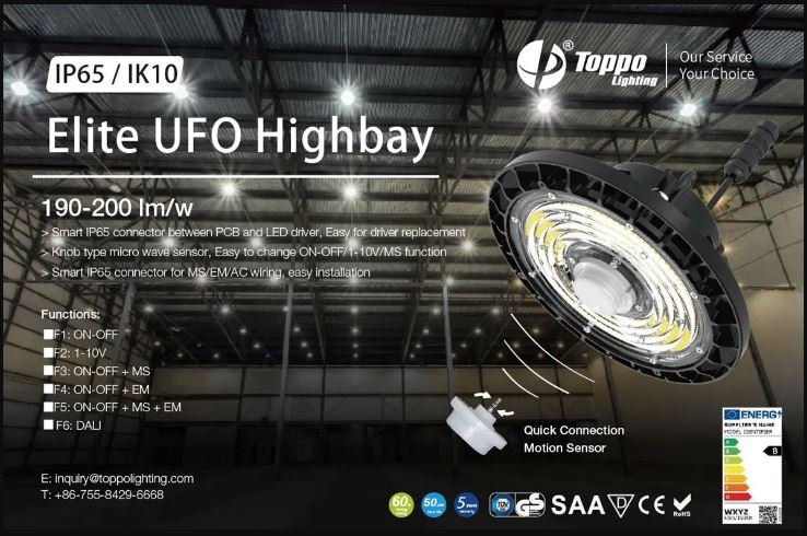 Toppo Lighting new release: Elite UFO High bay Light, Compact UFO design, IP65 waterproof and IK10 protection, high lumen up to 190-200lm/w, optional 60/90/120°beam angle Ripple Lens reflector. It can be ring suspension or surface bracket mounted. Smart Features: 1.Smart IP65 connector between PCB and LED driver, easy for driver replacement 2.Smart IP65 connector for MS/ EM/ AC wiring, easy installation to save labor cost 3.Knob type microwave motion sensor in the middle of the Ripple Lens reflector, easy to change ON-OFF/ 1-10V/ MS Function.